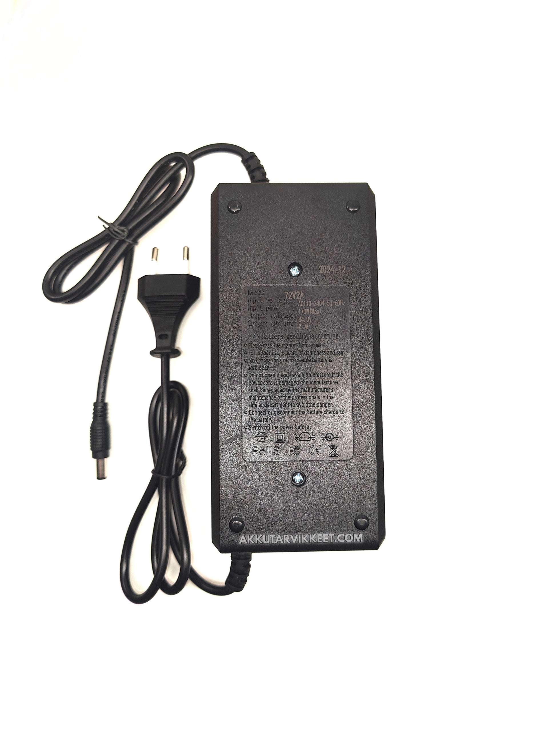 Akkulaturi 72V li-ion akuille. Sisältää sisäänrakennetun tuulettimen, joka pitää laturin lämpötilan alhaisena sekä LED-merkkivalon, joka kertoo kun akku on täynnä.