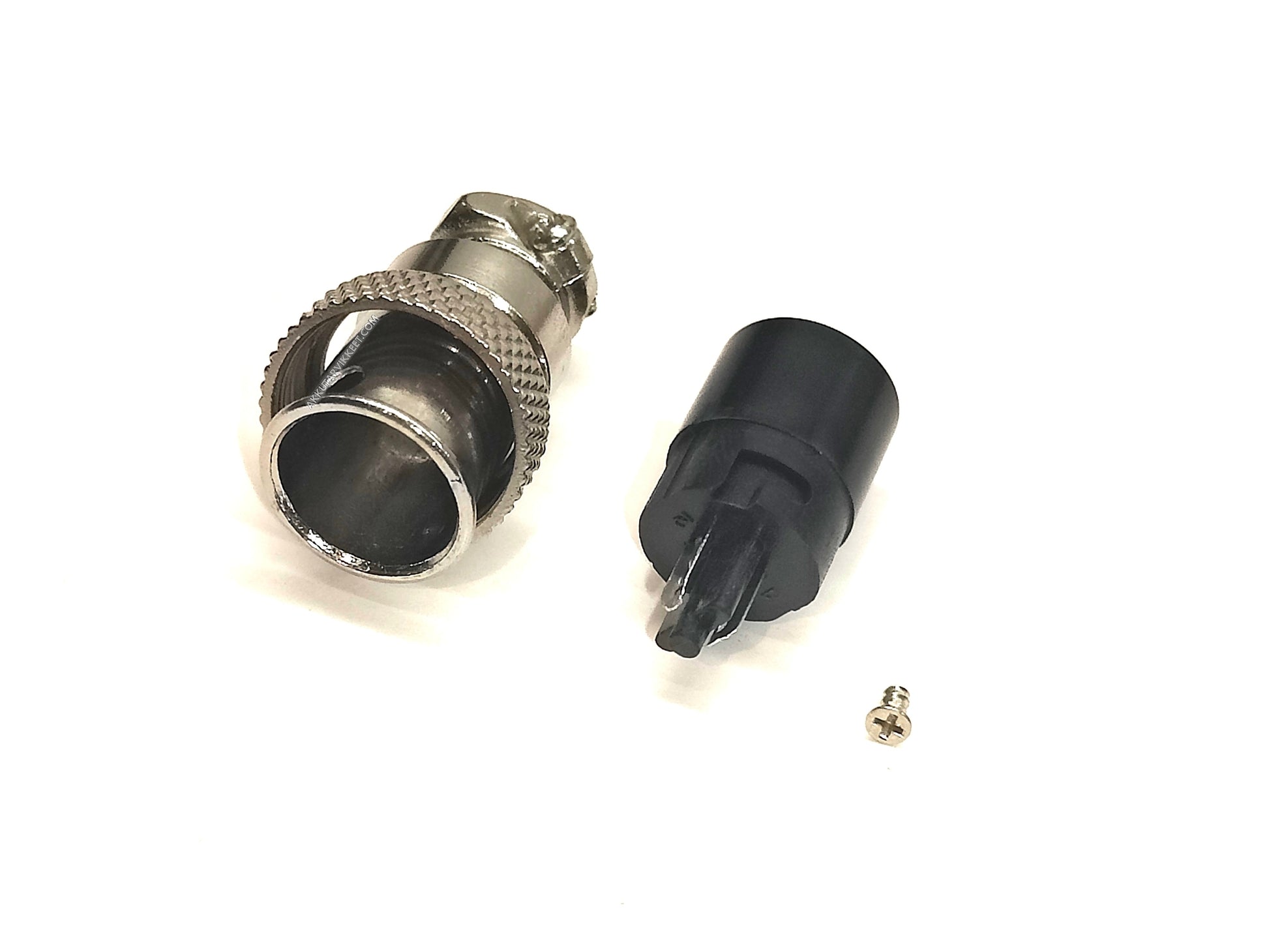 Metallinen GX16 Aviation-liitin. Napojen lukumäärä 2-10 kappaletta. Naarasliittimen sisäkierteen / Urosliittimen ulkokierteen halkaisija 16mm.