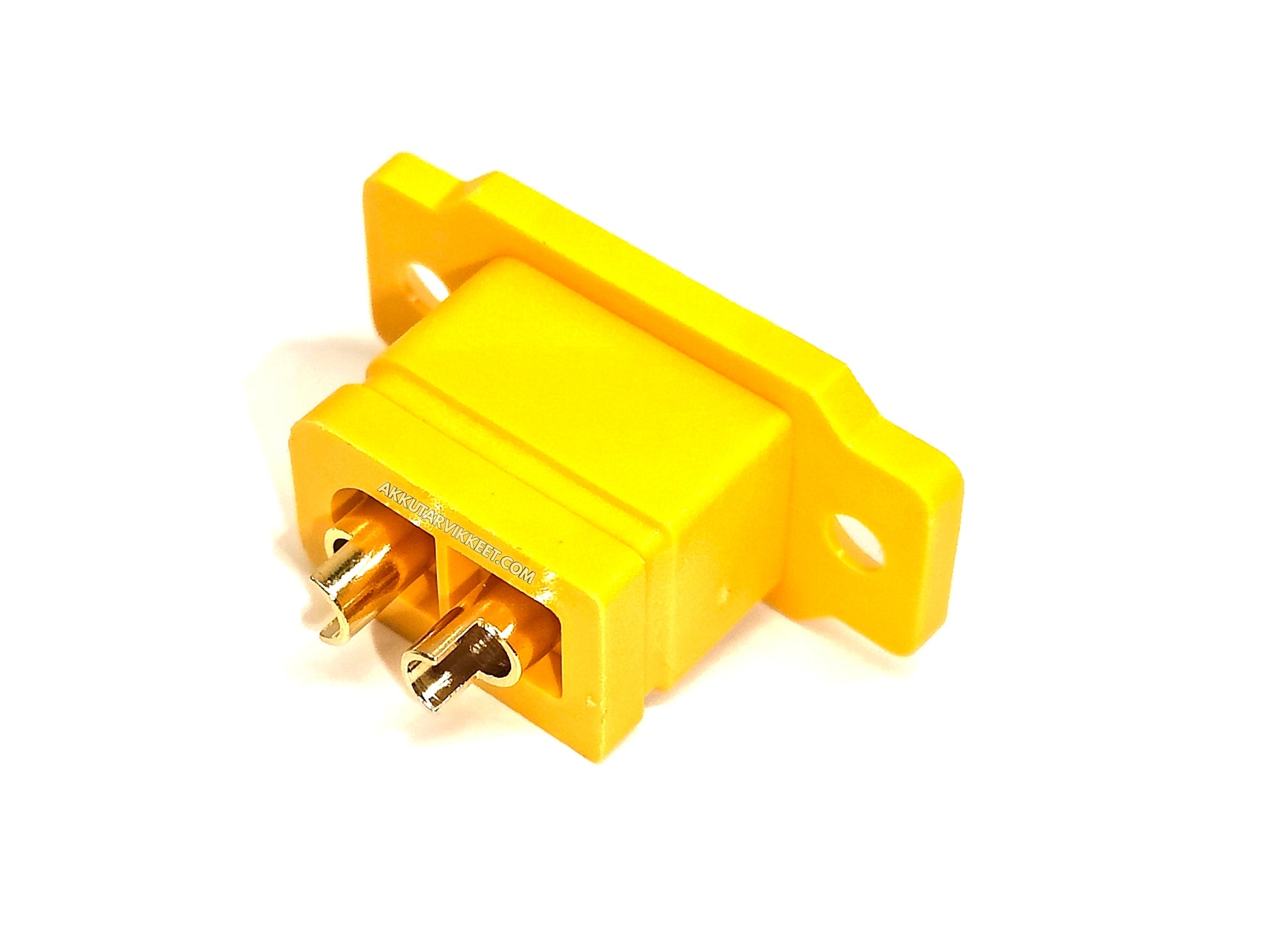 Urospuolinen XT60-liitin kahdella kiinnitysreiällä varustettuna. Käy kiinteisiin akkukoteloihin ja muihin kohteisiin, jossa liitin halutaan kiinnittää levyyn tai paneeliin.